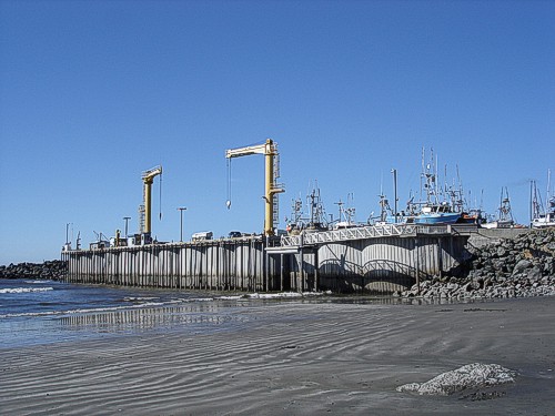 a view of the local port where the boats are lifted out of the water each day and stored on top of the dock...